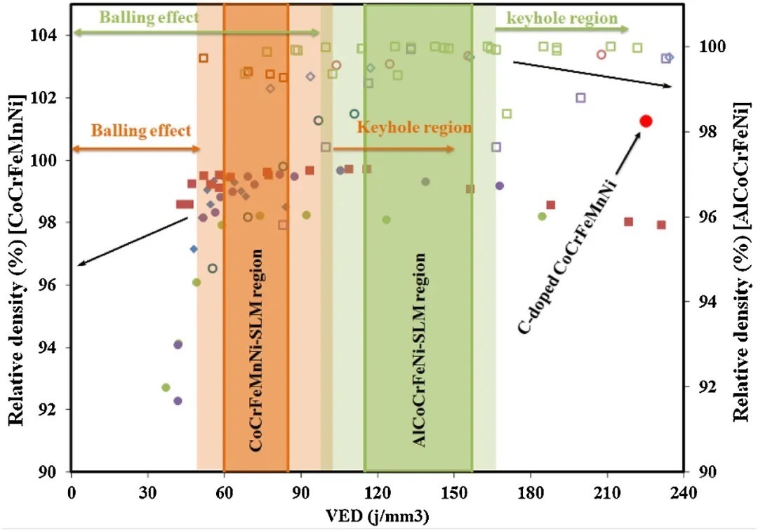此处的 P、v、 h 和 t 分别为激光功率、扫描速度、扫描间距和层厚度,这些参数对HEAs的传热和凝固行为至关重要。在VED的数值较低的时候,裂纹、气孔和分层会在SLM制造HEAs的时候会发生。不充分的VED或过度的扫描速度会导致熔池的不稳定性,如球化。一个充分的VED,在适合的相对的低的扫描速度下会增加温度和提高熔池的流动性。高温也会让足够的熔池金属形成膨胀和提高层层之间的连接和致密化。在另外一个方面,过渡的能量输入会增加飞溅和金属自熔池的蒸发,这是主导匙孔模式和导致不规则的空穴,也称之为匙孔气孔。因此,优化的VED也许可以用来定义每一HEA来打印出高质量的产品且具有最小的可能存在的缺陷。SLM打印的CoCrFeMnNi和 AlCoCrFeMnNi HEA系统的相对密度随着VED的变化见下图7所示。VED的范围同球化效应、匙孔气孔相关。然而,非常明显的是打印一个无缺陷的HEA并不是只同VED的数值相关,同时还同每一个单独的参数相关,所以也需要必须进行仔细的选择。此外,化学成分也对优化VED的数值起到至关重要的作用。