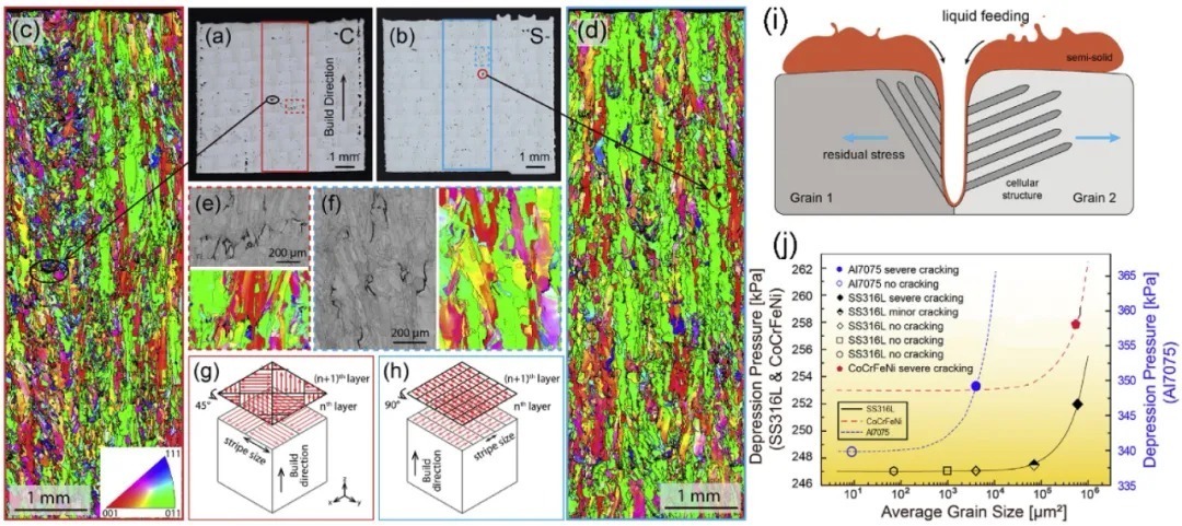 晶间热裂纹在SLM制备 CoCrFeNi HEA的时候,不管工艺参数如何都会发生。Sun等人观察了在CoCrFeNi HEA中裂纹周边的合金元素的分布,这表明在这一合金中热裂纹也许不会由于元素偏析造成液相薄膜的形成。为了证明这一问题,对沉积态的样品(S和C)的横截面沿着制造方向进行金相观察,见下图ab所示。样品的显微组织由粗大的柱状晶且伴随着晶间裂纹,见下图6c-f。样品C和S采用棋盘的模式和条带的扫描策略进行打印,见下图6g和h。Sun等人示意的给出了热裂纹的形成机制,见下图6中的i。在凝固的时候,热收缩诱导的残余拉应力平行于晶粒边界。位错森林在沉积态中的胞状结构中的存在也表明了残余应力的高水平。在凝固的最后阶段,当液相供给在蘑菇区不充分的时候,一些热裂纹会形成以适应这一残余拉应力。此外,他们发展了一个模型,通过考虑蘑菇区塌陷区的压力(基于Rappaz-Drezet-Gremaud (RDG)准则,来量化晶粒尺寸对SLM制造过程中的热裂纹的影响。下图6J中的结果显示一旦晶粒尺寸超过了热裂纹的形成 104 μm2,这是SLM制造CoCrFeNi HEA的数值。同CoCrFeNi HEA相似,据报道 CoCrFeMnNi HEA也在SLM制造过程中容易产生热裂纹,不管工艺参数如何,都会产生裂纹。