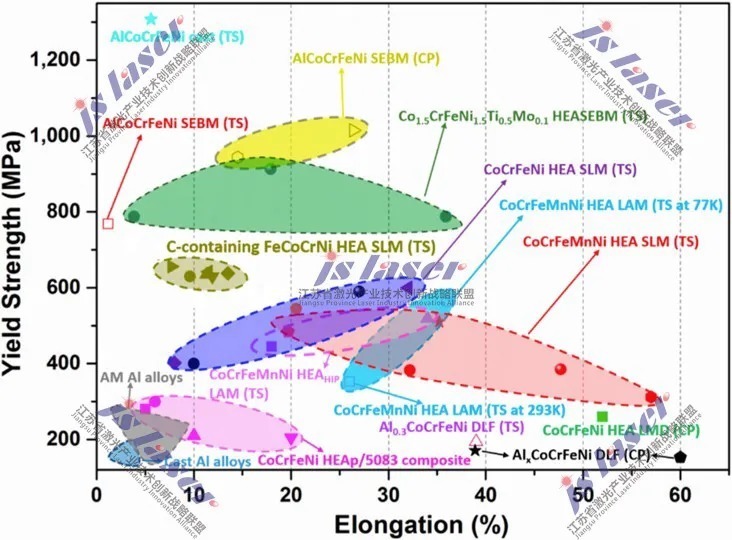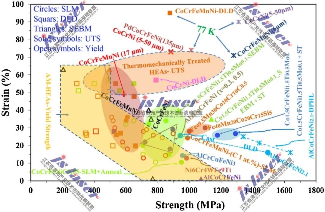 ▲图9. 不同的AM技术打印的不同的HEAs的极限拉伸强度和屈服强度Vs延伸率的总结图